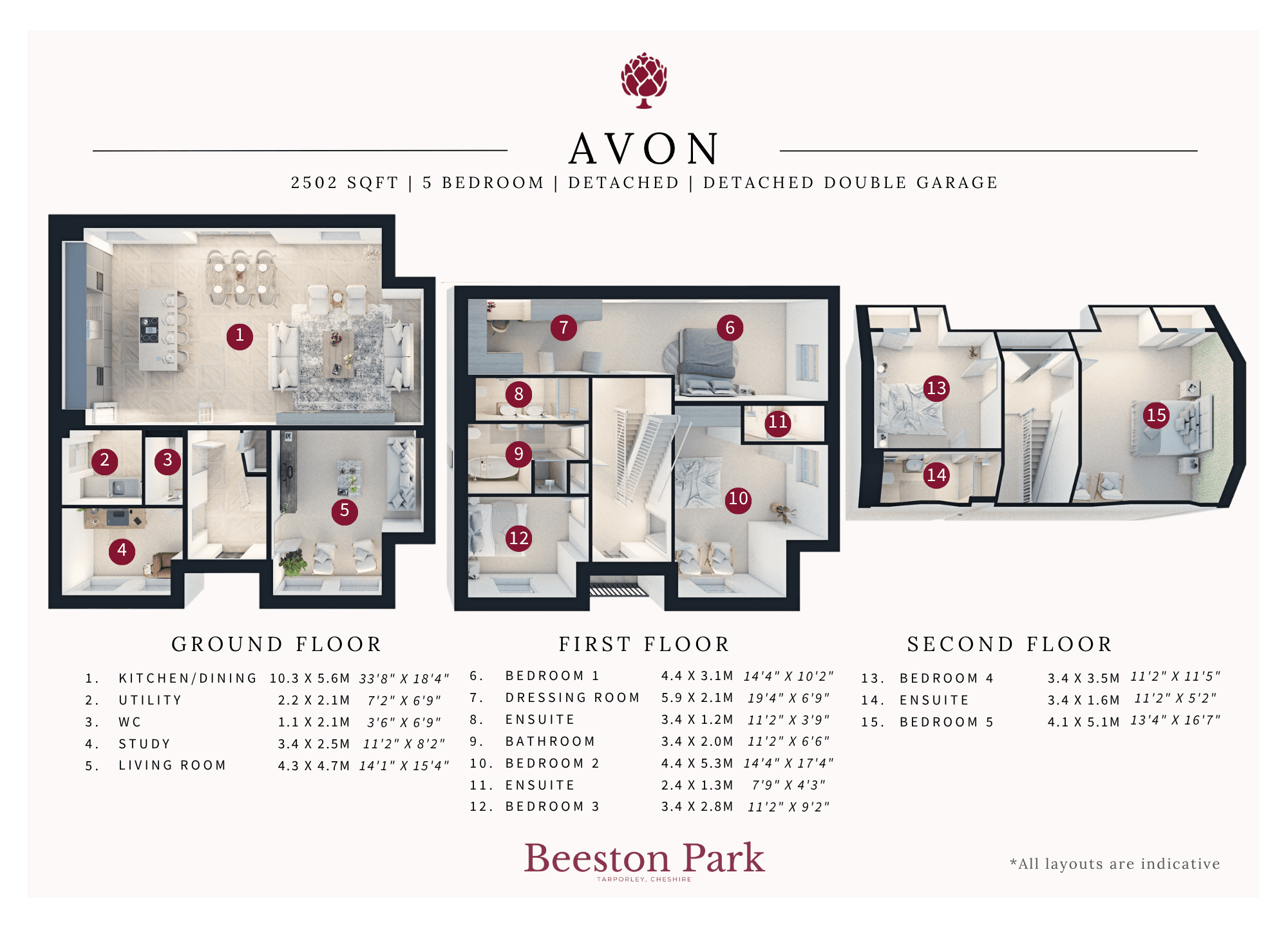 The Avon is an beautiful five-bedroom home set across three storeys, with a mock-Tudor exterior and detached double garage. On the ground floor, you'll find a spacious lounge, study, and utility room, alongside an open-plan kitchen, dining and family area with sliding doors leading to the rear garden.