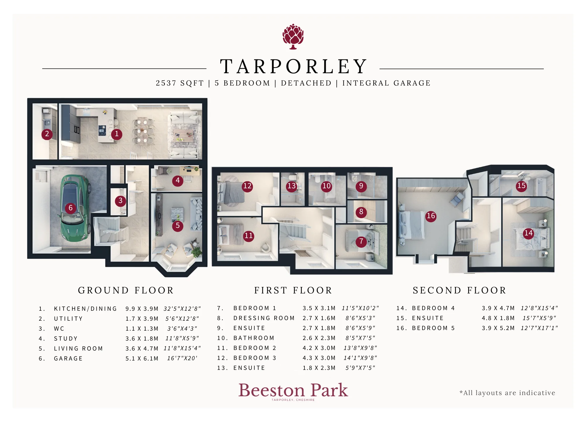 The Tarporley is an versatile five-bedroom home set across three storeys, with a striking red brick or mock-Tudor exterior and integral garage. The perfect family home, the Tarporley features an open plan kitchen-living as well as a utility, study and four en-suite bedrooms.