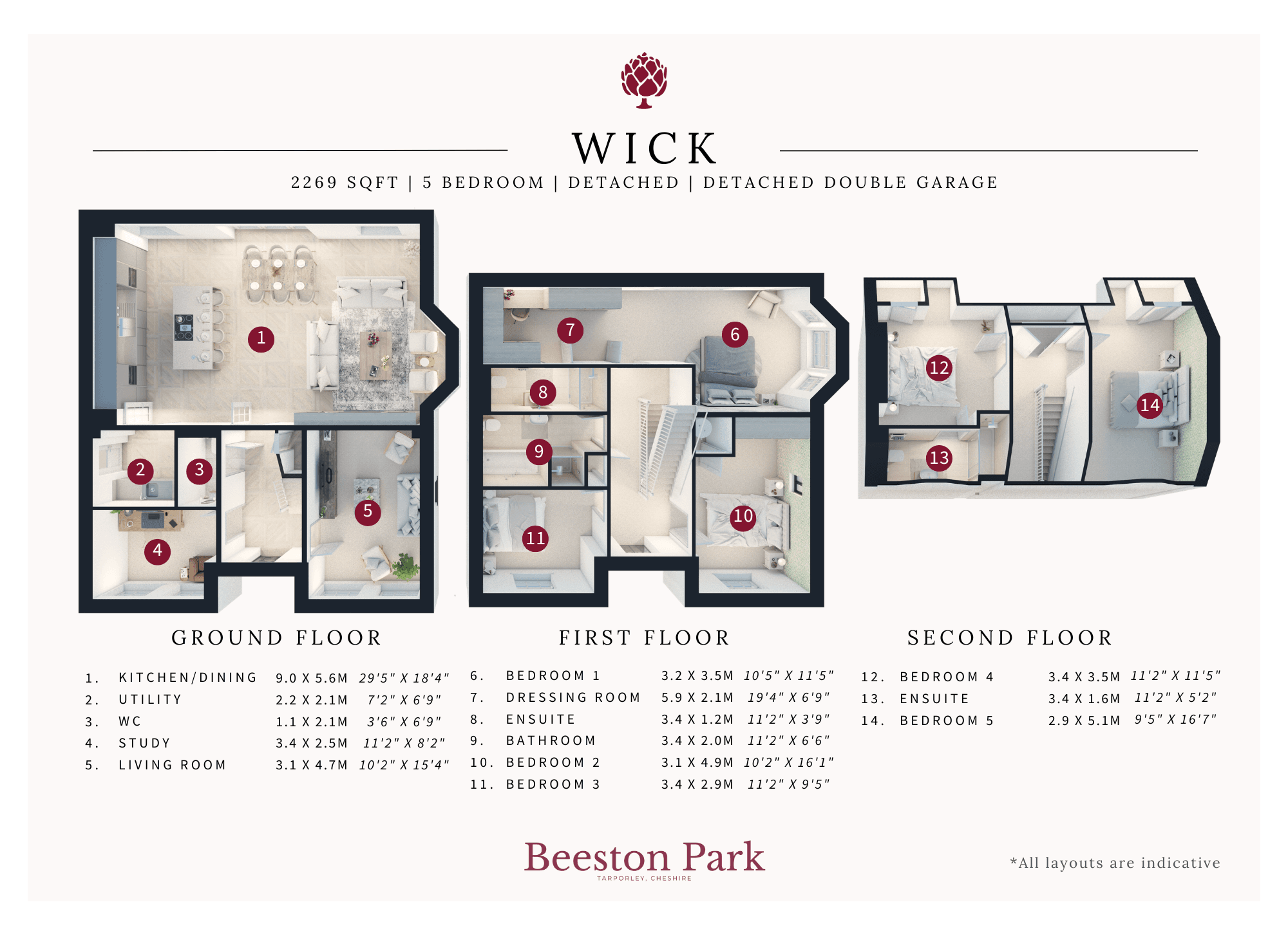 The Wick is an elegant five-bedroom home set across three storeys, with a mock-Tudor exterior and detached double garage. On the ground floor, you'll find a spacious lounge, study, and utility room, alongside an open-plan kitchen, dining and family area with sliding doors leading to the rear garden.